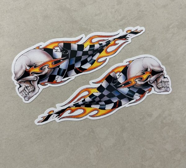 2 x SKULL AND CHEQUERED FLAMES Stickers, handed.Â