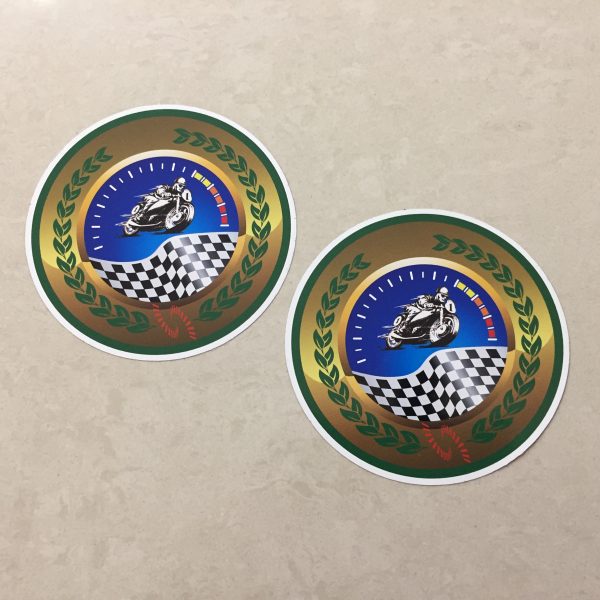 MOTORCYCLE SPEEDWAY RACING STICKERS. A man racing a motorcycle on a speedway and a chequered flag overlays a speedometer. A green laurel leaf on a gold background surrounds the image.