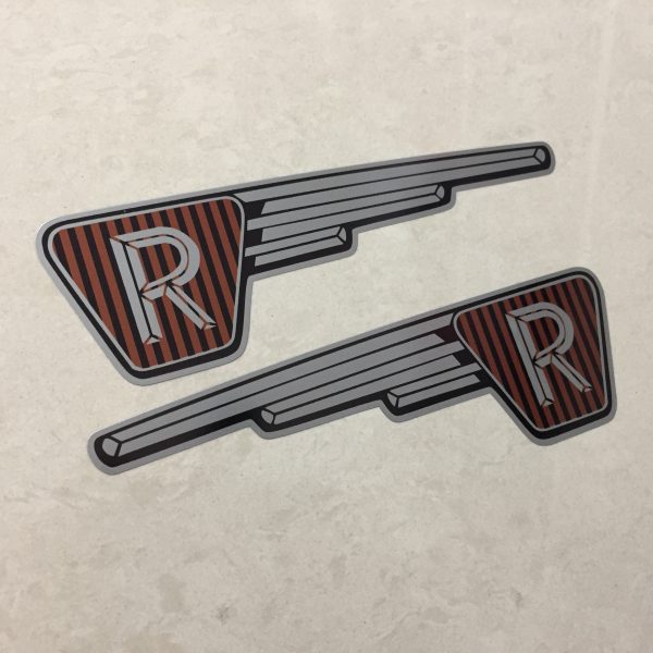 RALEIGH RUNABOUT FAIRING STICKERS. The letter R in silver on a black and brown vertical striped background inside an inverted triangle. A silver wing effect protrudes from one side.