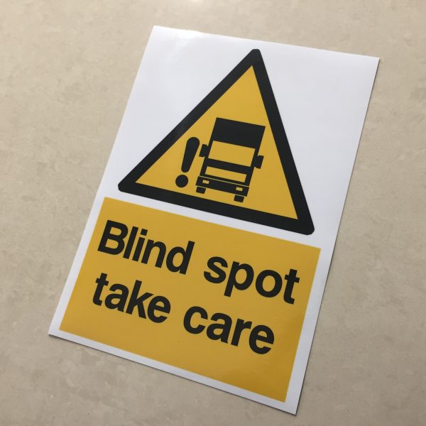 BLIND SPOT STICKER. A black and yellow hazard triangle featuring a lorry and an exclamation mark. Below in black lettering Blind spot take care within a yellow rectangle.