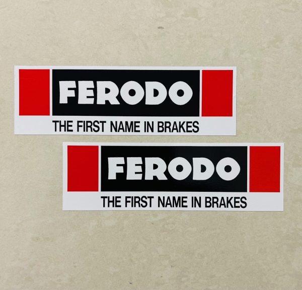 FERODO BRAKES STICKERS. Ferodo in white lettering on black and The First Name In Brakes in black on white with a red and white border.