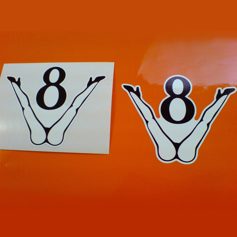 V8 HOT ROD STICKERS. A number 8 in black sits between a pair of white women's legs and bottom apart in a V shape. She is wearing black heels.