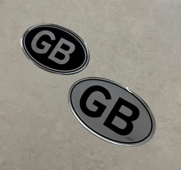 GB STICKER DOMED RESIN GEL. GB in uppercase lettering on an oval sticker. Black letters on chrome or chrome letters on a black background.