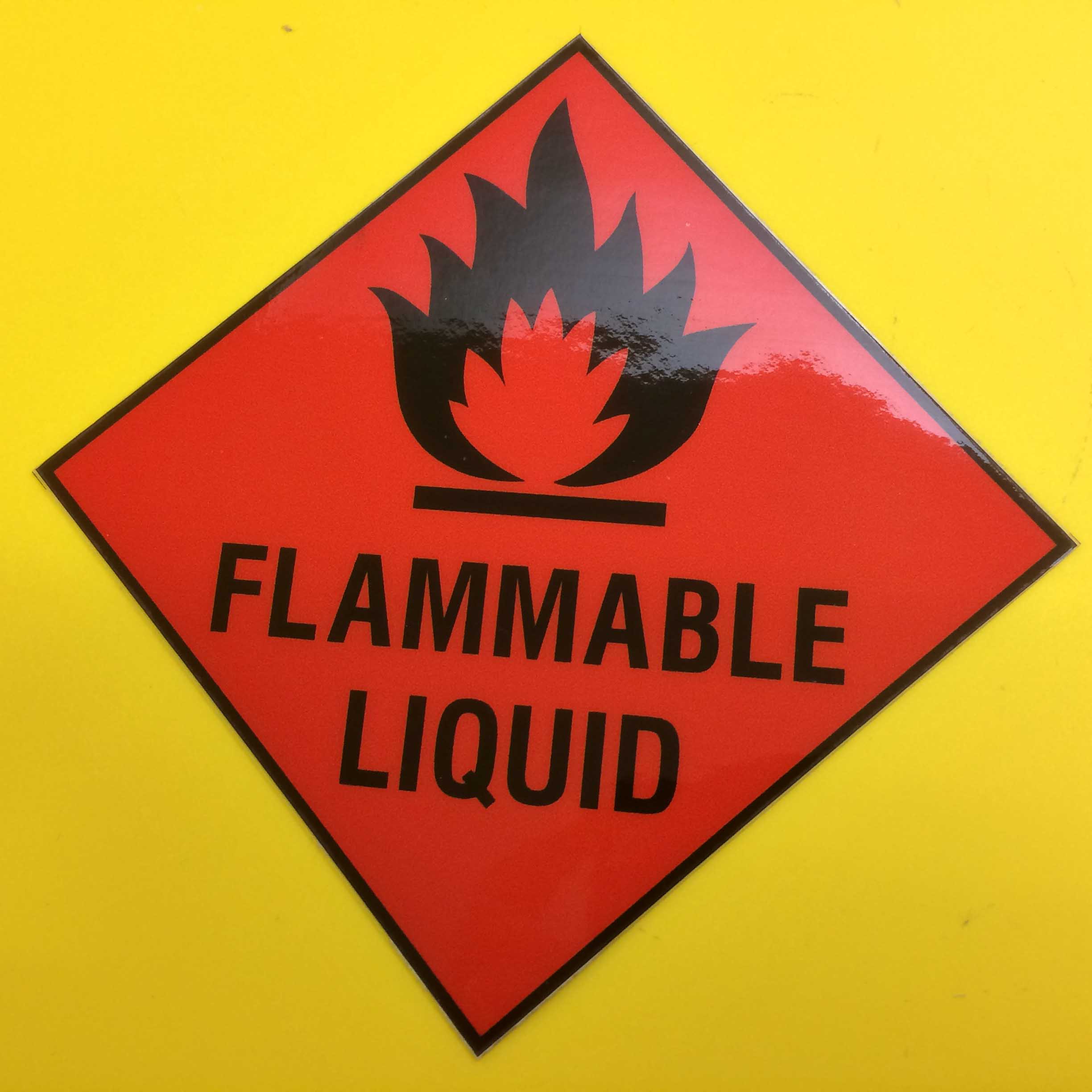 FLAMMABLE LIQUID WARNING STICKER. Black flames at the top. Below is Flammable Liquid in black capitals. Red, diamond shaped sticker edged in black.